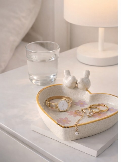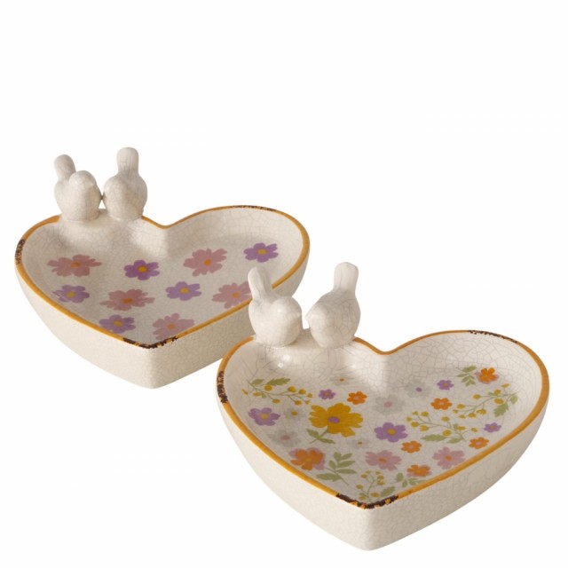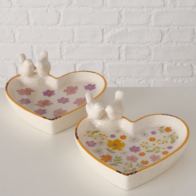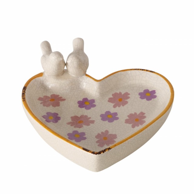 Fuglebadet har en håndlaget hjerteform, blank glasur, blomstertrykk rundt hele verket og krakeleringseffekt. Bredden er 20 cm, lengden 19 cm og høyden er 7,5 cm. Fuglebadet er frostbestandig, noe som sikrer at det er egnet for utendørs bruk året rundt.