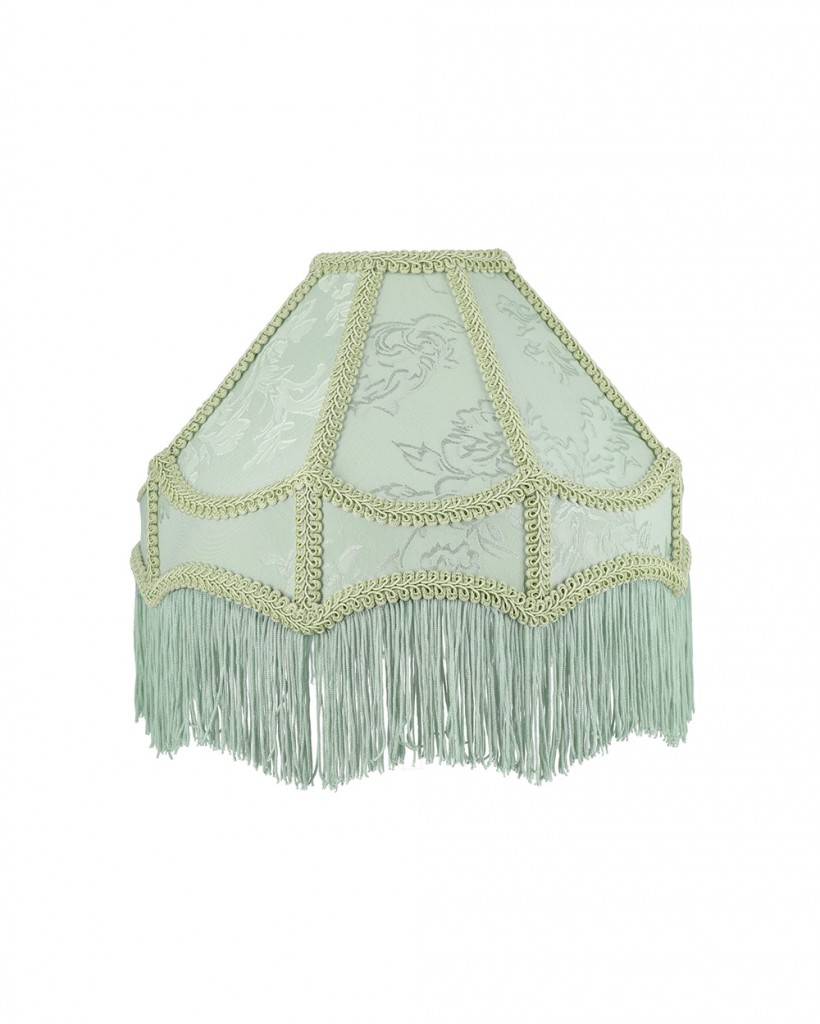 Lampeskjerm med frynser Artikkelnr.: 1005605 Pistasjfarget lampeskjerm med frynser, vakkert sydde kanter og utsmykkede mønstre. Skjermens vendbare lampeholder gjør at den kan brukes til både bord- og taklamper. 30 x 18 cm. NOK1 295,00 inkl. mva. På lager Kjøp Del dette