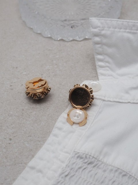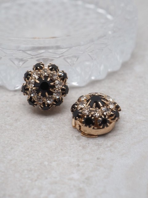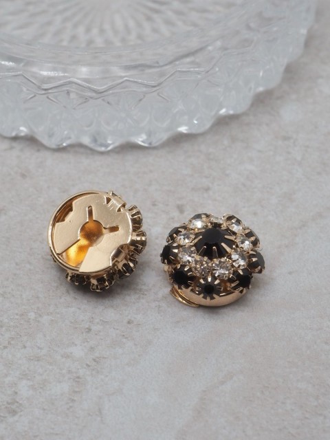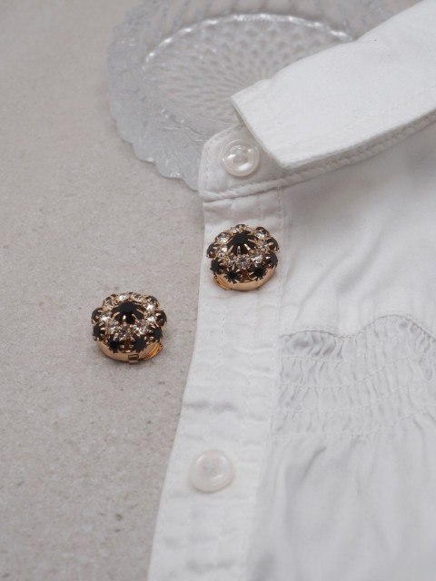 Gi antrekket et sofistikert preg med denne elegante knappepynten i gullfarge, formet som en blomst med glitrende svarte glassteiner. Perfekt til å skjule knapper på skjorter eller gensere, og tilfører et stilfullt og moderne uttrykk.