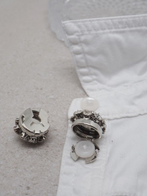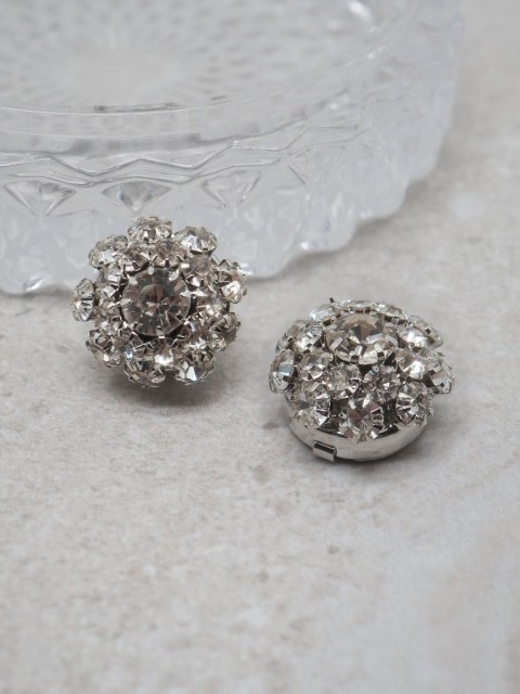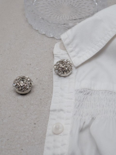Gi antrekket et elegant løft med denne nydelige knappepynten formet som en blomst i sølvfarge, pyntet med glitrende glassteiner. Perfekt for å skjule knapper på skjorter eller gensere – samtidig som den tilfører et delikat og luksuriøst uttrykk.