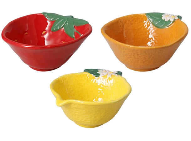 Sett med tre keramikkskåler - Jordbær, sitron og appelsin! Artikkelnr.: 127324 Hver skål er ca 17 x 12 cm. NOK349,00 inkl. mva. På lager Kjøp Del dette